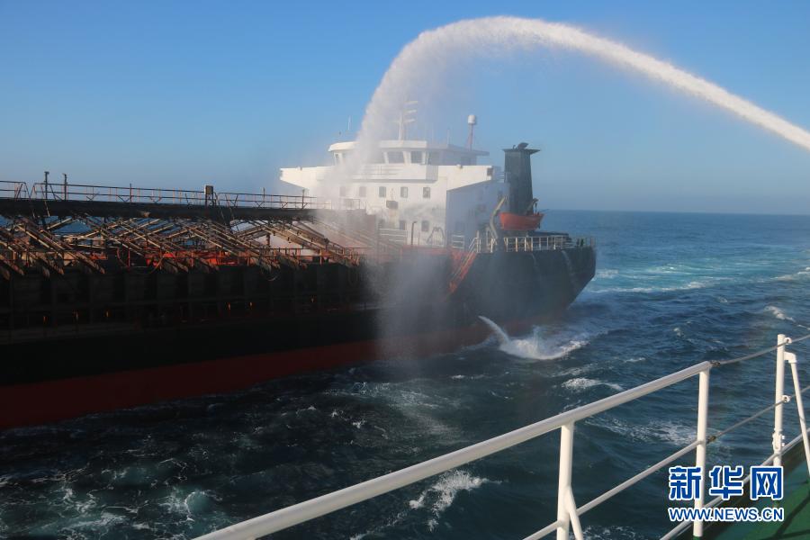 海警執(zhí)法艦艇依法用水炮壓制逃竄的涉案船舶(11月19日攝)。新華社發(fā)(許峰 攝)