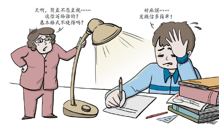 齊齊從小學(xué)一年級(jí)就開(kāi)始練習(xí)毛筆字,如今已經(jīng)能寫(xiě)出很不錯(cuò)的行書(shū),但他也從不寫(xiě)信,“有必要嗎?”齊齊說(shuō),父母要求他每個(gè)月要給遠(yuǎn)在老家的祖父母、外祖父母打電話,每次電話的通話時(shí)間也就兩三分鐘,“我爸他們也就是問(wèn)奶奶吃飯了沒(méi),多買點(diǎn)吃的,不舒服趕緊去醫(yī)院……就這幾句話,真沒(méi)營(yíng)養(yǎng)?!?/p>
