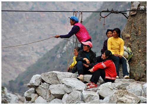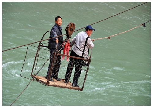 ????2013年3月7日,云南省會(huì)澤縣火紅鄉(xiāng)的村民牽引溜索過(guò)江。楊文斌 攝