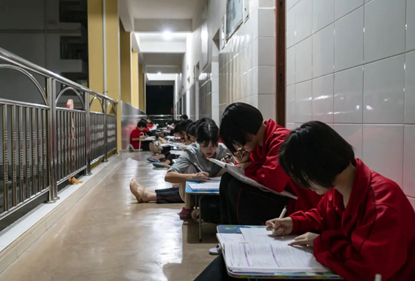 子夜時分,華坪女高的宿舍樓樓道內(nèi)燈火通明,學(xué)生在樓道里支起小桌,席地而坐,老師在樓道內(nèi)來回巡視,為學(xué)生答疑解惑。