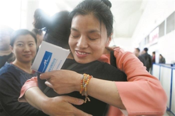 遼寧省援疆專家返程時,與援疆前方指揮部的干部相擁。趙敬東 攝/人民圖片