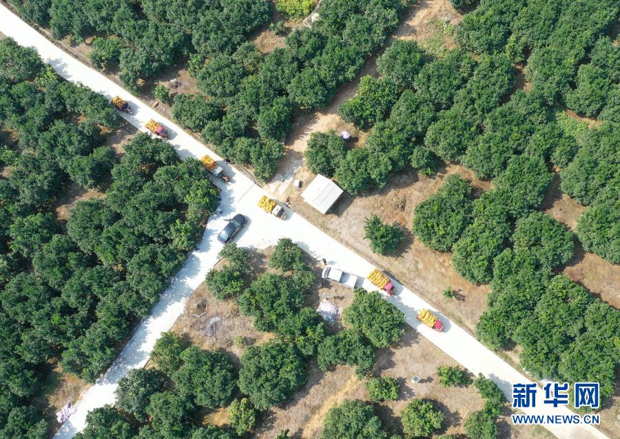 在廣西羅城仫佬族自治縣金玉柚生態(tài)產(chǎn)業(yè)扶貧示范區(qū),裝載柚子的車輛在柚子園內(nèi)行駛(無人機照片,2019年11月5日攝)。新華社記者 陸波岸 攝