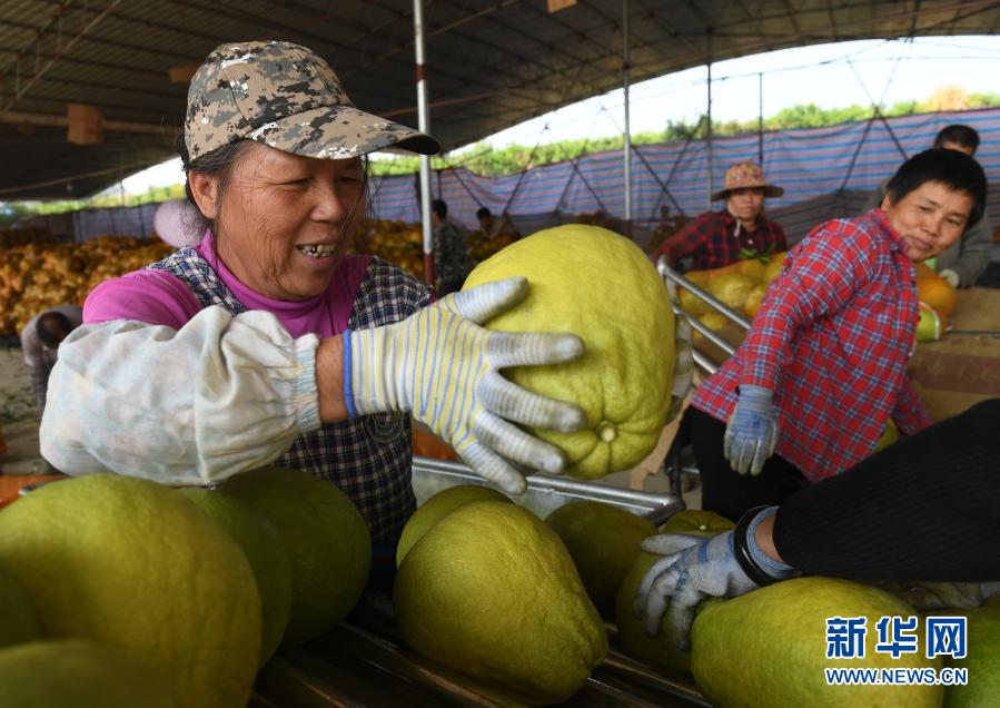 在廣西羅城仫佬族自治縣金玉柚生態(tài)產(chǎn)業(yè)扶貧示范區(qū),村民在分揀柚子準備裝車外銷(2019年11月5日攝)。新華社記者 陸波岸 攝