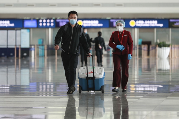 ▲ 2020年4月24日,武漢協(xié)和醫(yī)院心外科醫(yī)生盧雄豪(左)運(yùn)送來自山東的供肺抵達(dá)武漢天河機(jī)場(chǎng)。疫情期間原定航班取消,移植團(tuán)隊(duì)與中國國際航空公司聯(lián)系后,該公司緊急啟動(dòng)綠色通道,重新開通此航班。新華社記者 沈伯韓攝