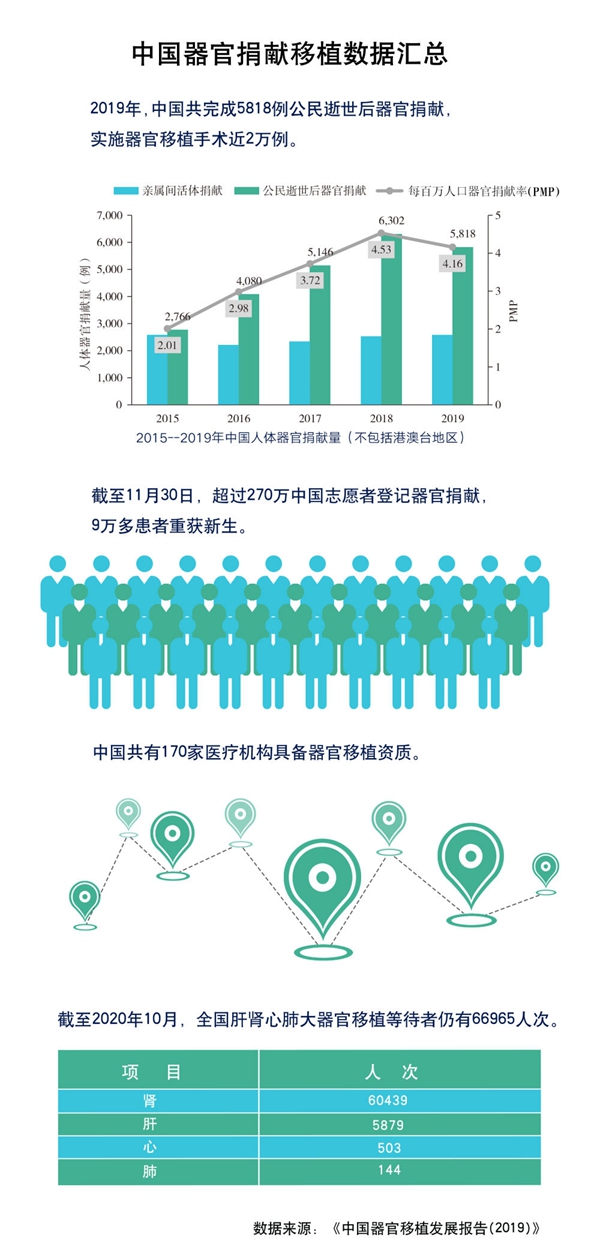 ——進(jìn)一步拓寬器官捐獻(xiàn)來源滿足移植需求。“中國器官捐獻(xiàn)數(shù)量和捐獻(xiàn)率雖逐年增長(zhǎng),但與國內(nèi)患者的巨大需求相比相距甚遠(yuǎn)?!蓖鹾2ㄕf,截至2020年10月,全國仍有60439人次等待腎移植、5879人次等待肝移植、503人次等待心移植、144人次等待肺移植。