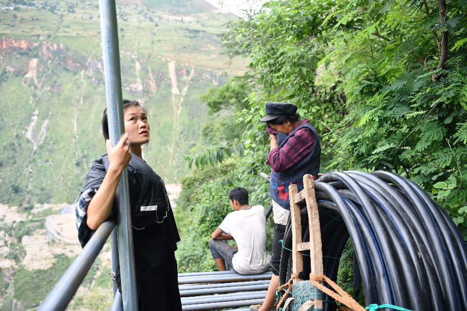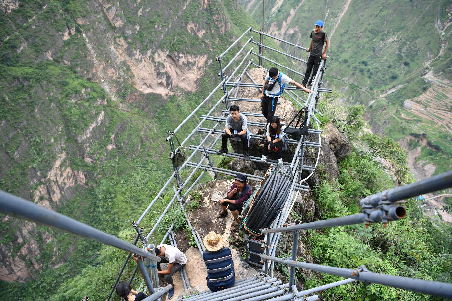 ????2017年9月初,四川涼山“懸崖村”村民背貨物通過天梯上山,中途休息。四川省涼山州昭覺縣支爾莫鄉(xiāng)阿土列爾村,坐落于海拔約1600米的山坳中,從山底到山頂村莊海拔高差近1000米,村民往返村子都需要借助懸崖峭壁間的天梯,從而被稱為“懸崖村”。為緩解村民出行險(xiǎn)的問題,當(dāng)?shù)赝度?20噸鋼材、共6000根鋼管修筑了2556級(jí)“鋼管天梯”,工程于2017年6月底徹底完工,如今,“鋼管天梯”已經(jīng)取代了之前更危險(xiǎn)的藤梯,成為村民通往外界唯一的道路。 張浪 攝