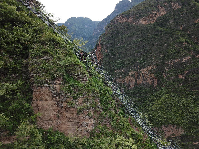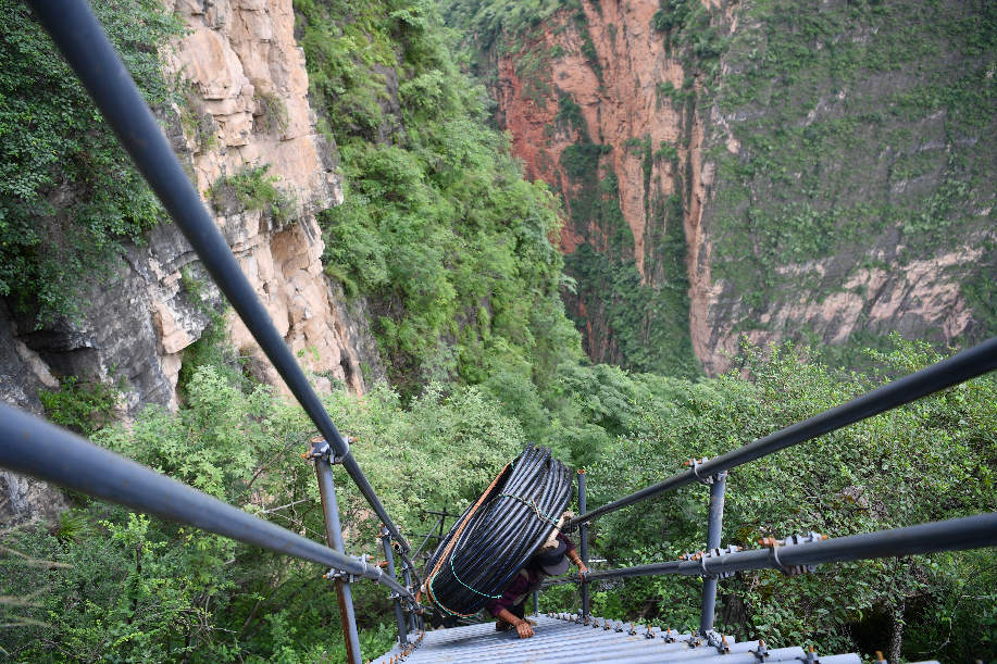 2017年9月初,四川涼山“懸崖村”村民背貨物通過天梯上山。四川省涼山州昭覺縣支爾莫鄉(xiāng)阿土列爾村,坐落于海拔約1600米的山坳中,從山底到山頂村莊海拔高差近1000米,村民往返村子都需要借助懸崖峭壁間的天梯,從而被稱為“懸崖村”。為緩解村民出行險(xiǎn)的問題,當(dāng)?shù)赝度?20噸鋼材、共6000根鋼管修筑了2556級(jí)“鋼管天梯”,工程于2017年6月底徹底完工,如今,“鋼管天梯”已經(jīng)取代了之前更危險(xiǎn)的藤梯,成為村民通往外界唯一的道路。 張浪 攝
