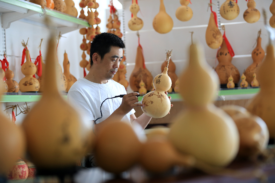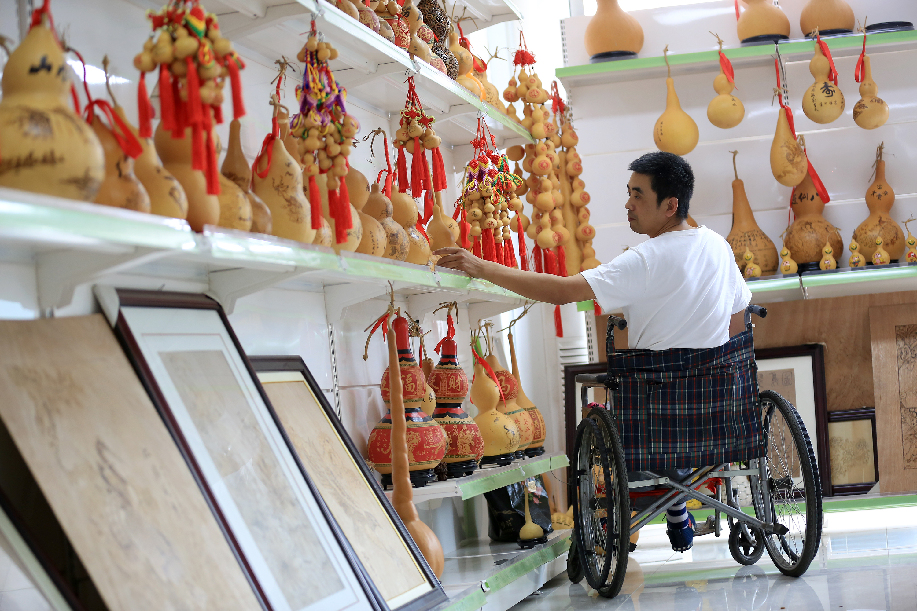 ????河北省邢臺市平鄉(xiāng)縣霍建龍,2014年因一起意外事故導(dǎo)致高位截癱。身殘志堅的他學(xué)習(xí)烙畫葫蘆藝術(shù),實現(xiàn)脫貧致富,并創(chuàng)辦了殘疾人烙畫葫蘆社,帶領(lǐng)其他殘疾貧困群眾脫貧致富。圖為霍建龍整理葫蘆作品。 柴更利 攝