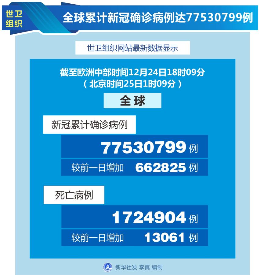 世衛(wèi)組織網(wǎng)站最新數(shù)據(jù)顯示,截至歐洲中部時(shí)間24日18時(shí)09分(北京時(shí)間25日1時(shí)09分),全球確診病例較前一日增加662825例,達(dá)到77530799例;死亡病例增加13061例,達(dá)到1724904例。