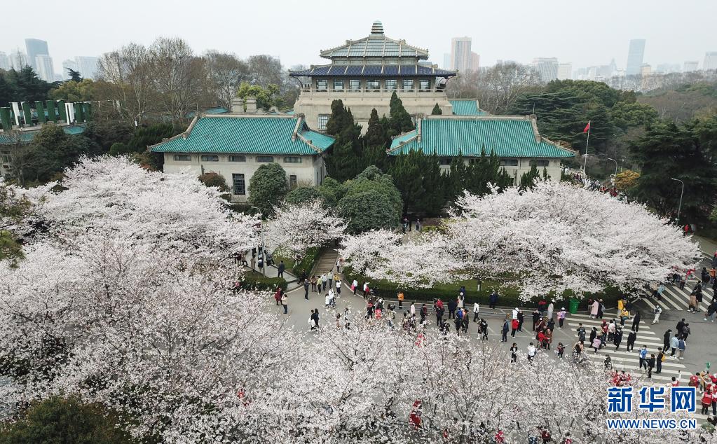 3月13日,武漢大學(xué)抗疫醫(yī)護(hù)人員賞櫻專場(chǎng)啟動(dòng),來自全國各地的援鄂抗疫英雄在櫻花樹下重逢,盡享櫻花之約(無人機(jī)照片)。新華社記者 程敏 攝