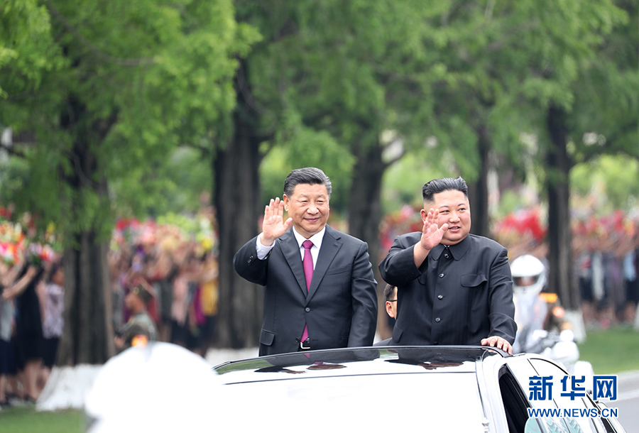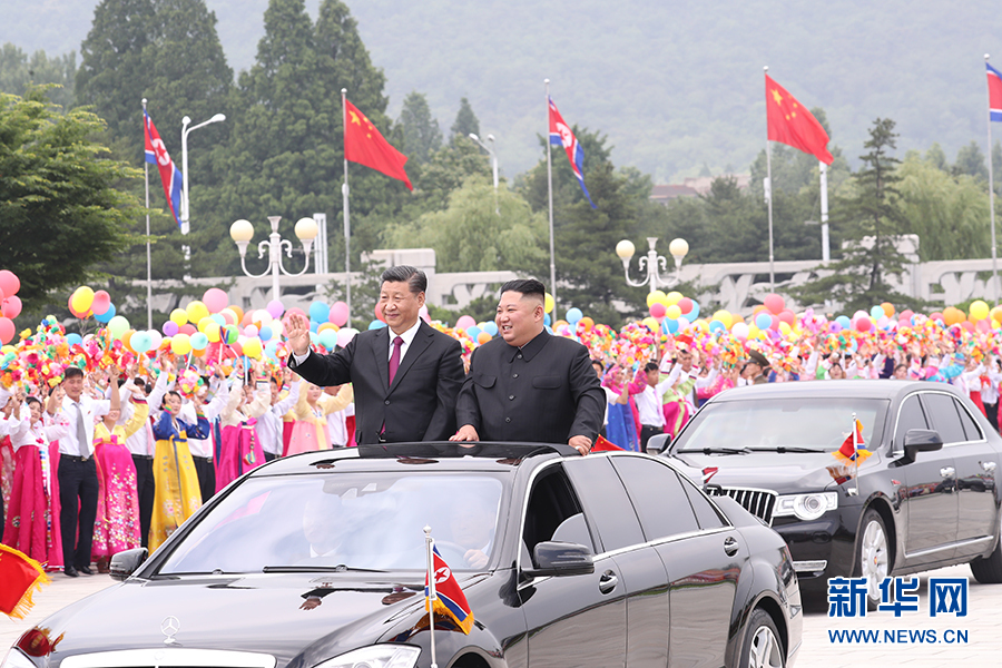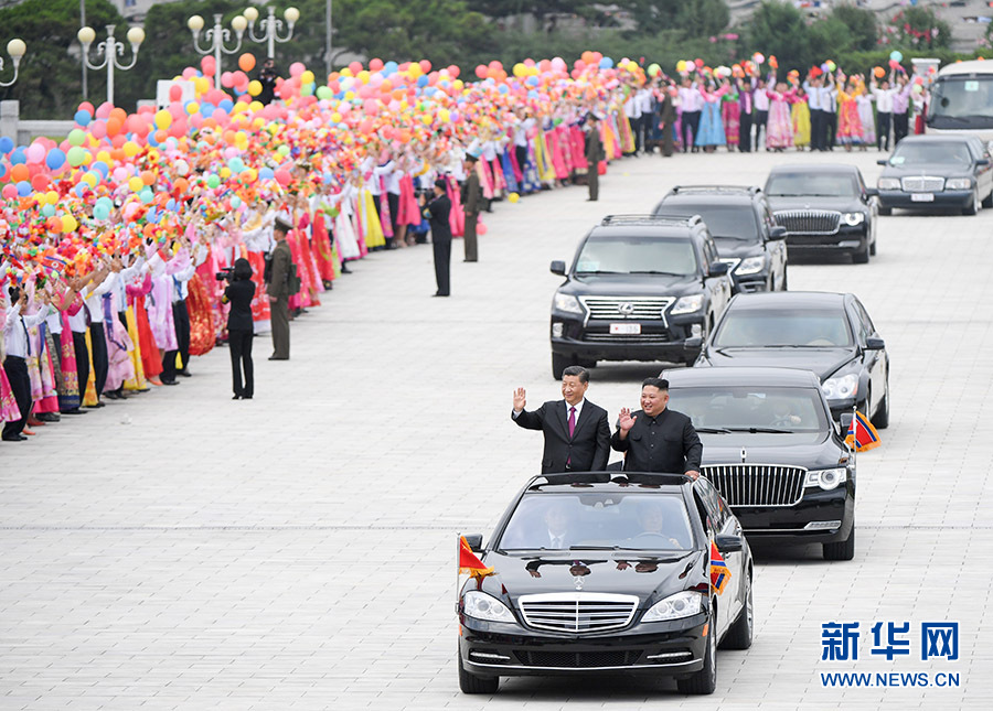 習近平抵達黎明大街路口,換乘敞篷車,與金正恩同車前往錦繡山太陽宮廣場。街道兩旁,人山人海,盛況空前。歡迎民眾站在高坡上,從住宅樓的窗臺上,向中國貴賓歡呼致敬。到處都是熱情的笑臉,友好的歡呼聲不絕于耳。習近平和金正恩向歡迎的人群頻頻揮手致意。