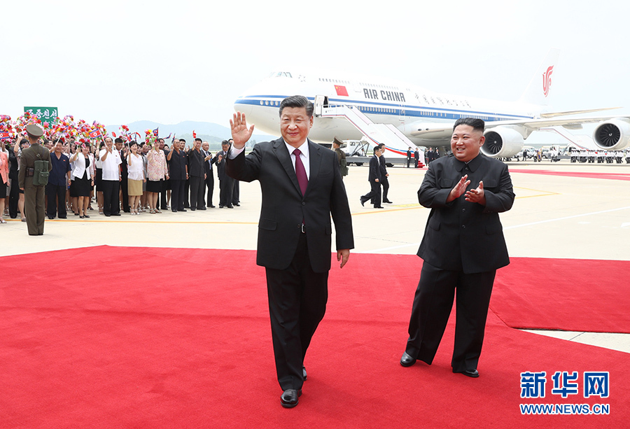 當?shù)貢r間12時許,習近平乘坐的專機抵達平壤順安機場。雨后初晴的平壤,天高云淡、氣候怡人,到處郁郁蔥蔥、繁花似錦,整個城市洋溢著友好熱烈的氣氛。機場上中朝兩國國旗迎風飄揚,“熱烈歡迎中國共產(chǎn)黨中央委員會總書記、中華人民共和國主席習近平同志”“鮮血凝成的朝中兩國人民之間牢不可破的友誼團結(jié)萬歲”大幅標語高高懸掛,近萬名群眾排列成整齊的隊伍,有力地揮動著花束,以歡快的口號和熱情的笑容,歡迎尊貴的中國客人到來。朝鮮勞動黨委員長、國務委員會委員長金正恩和夫人李雪主到機場迎接。