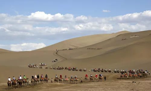 2019年6月,游客在敦煌市鳴沙山月牙泉景區(qū)游覽,領略大漠風光,體驗絲路風情。新華社發(fā)(張曉亮 攝)