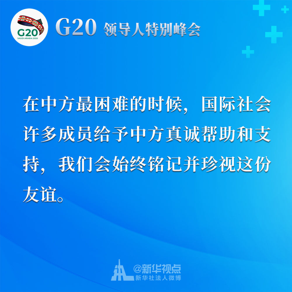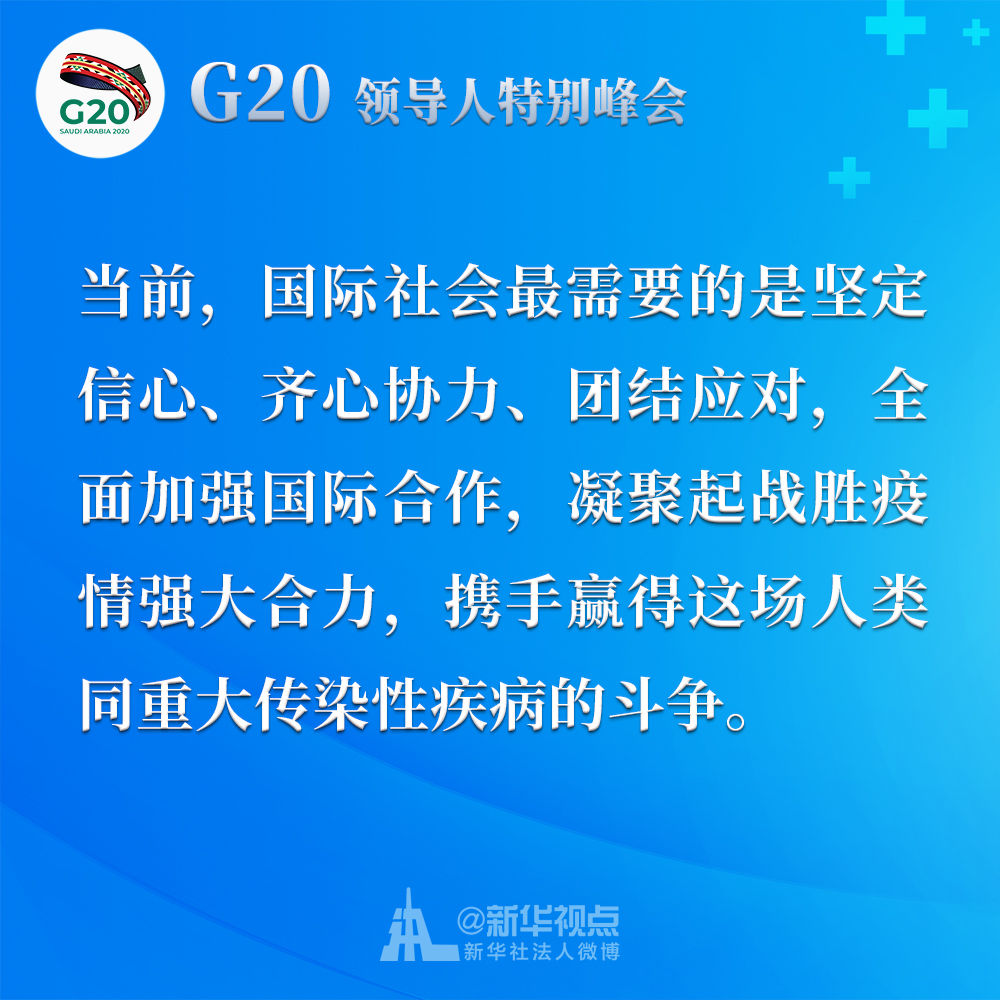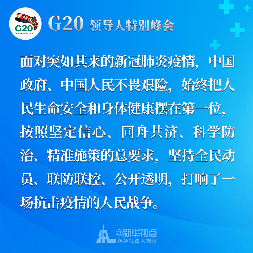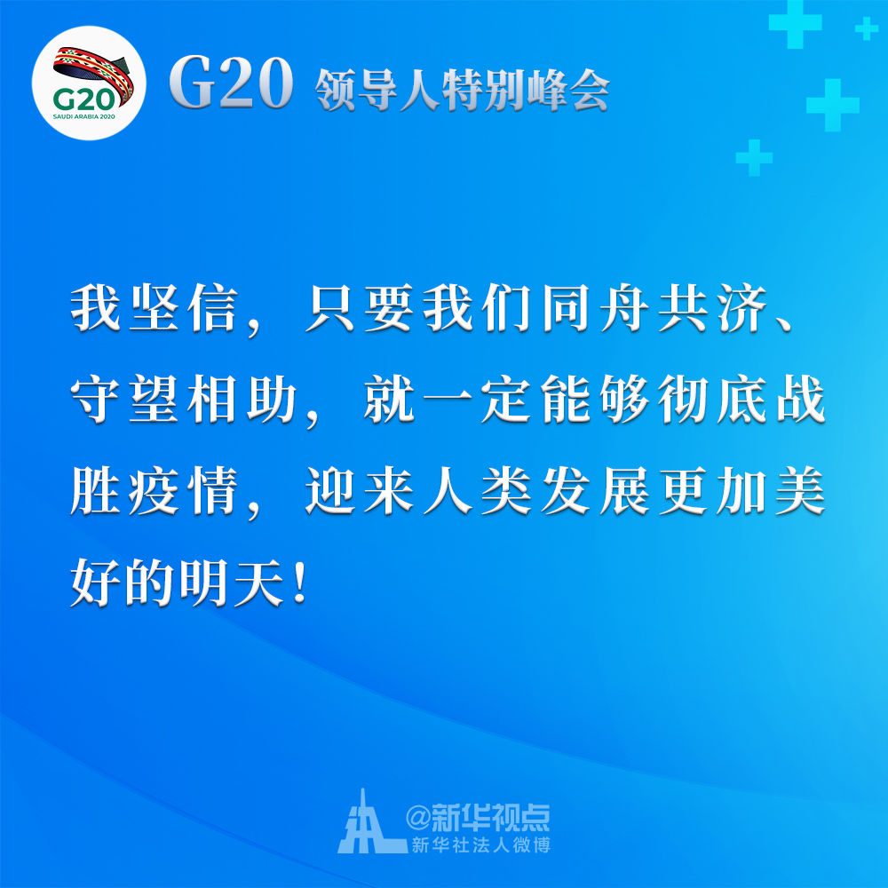 習(xí)近平在二十國集團(tuán)領(lǐng)導(dǎo)人應(yīng)對新冠肺炎特別峰會上重要講話金句↓