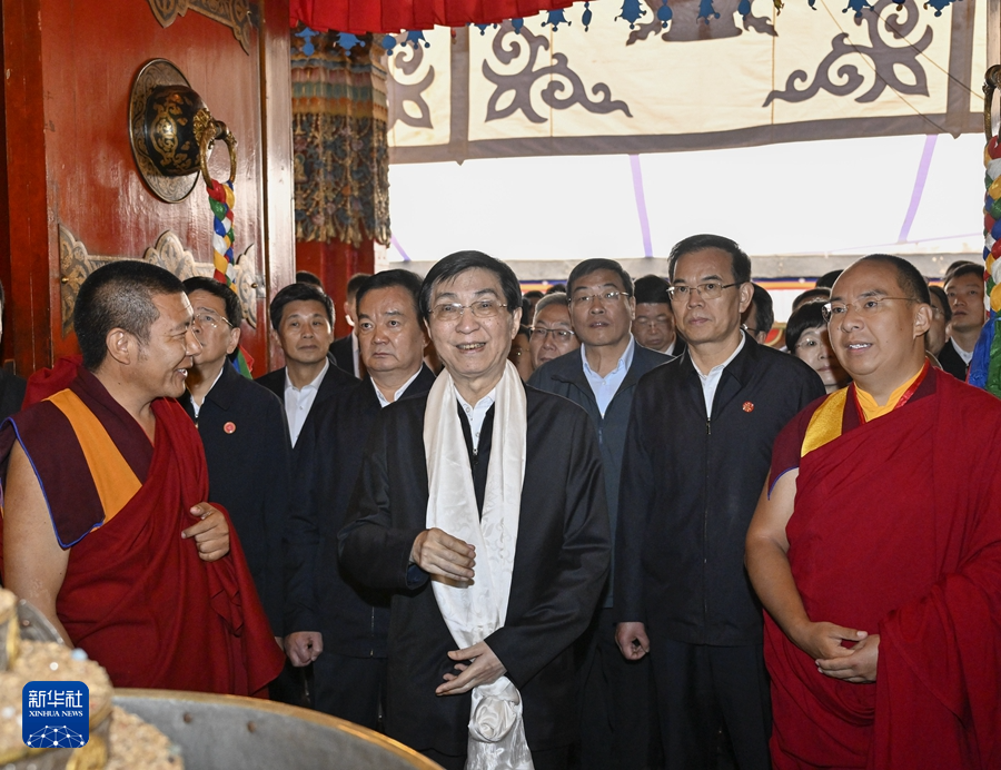 8月23日上午,受习近平总书记嘱托,带着党中央的亲切关怀和全国人民的深情祝福,中央代表团部分成员在日喀则看望慰问各族干部群众。这是王沪宁和中央代表团部分成员来到扎什伦布寺,看望慰问宗教界人士。新华社记者 殷博古 摄