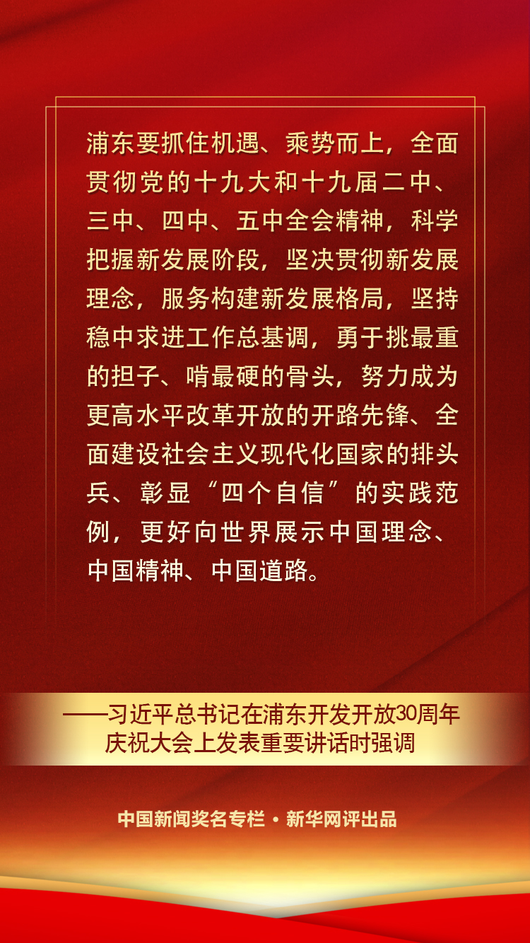 對歷史的最好回望,就是創(chuàng)造新的歷史。而立之年的浦東,正站在奮力打造新時代改革開放新高地的新起點,處處彰顯著勃勃生機和無限活力。要全力做強創(chuàng)新引擎,打造自主創(chuàng)新新高地;加強改革系統(tǒng)集成,激活高質(zhì)量發(fā)展新動力;深入推進高水平制度型開放,增創(chuàng)國際合作和競爭新優(yōu)勢;增強全球資源配置能力,服務(wù)構(gòu)建新發(fā)展格局;提高城市治理現(xiàn)代化水平,開創(chuàng)人民城市建設(shè)新局面……進入新時代,以習(xí)近平同志為核心的黨中央繼續(xù)對浦東開發(fā)開放提出明確要求,把一系列國家戰(zhàn)略任務(wù)放在浦東,推動浦東開發(fā)開放不斷展現(xiàn)新氣象。新時代再出發(fā),浦東要發(fā)揚敢拼敢闖的勁頭,勇于挑最重的擔(dān)子、啃最硬的骨頭,努力成為更高水平改革開放的開路先鋒、全面建設(shè)社會主義現(xiàn)代化國家的排頭兵、彰顯“四個自信”的實踐范例,更好向世界展示中國理念、中國精神、中國道路。