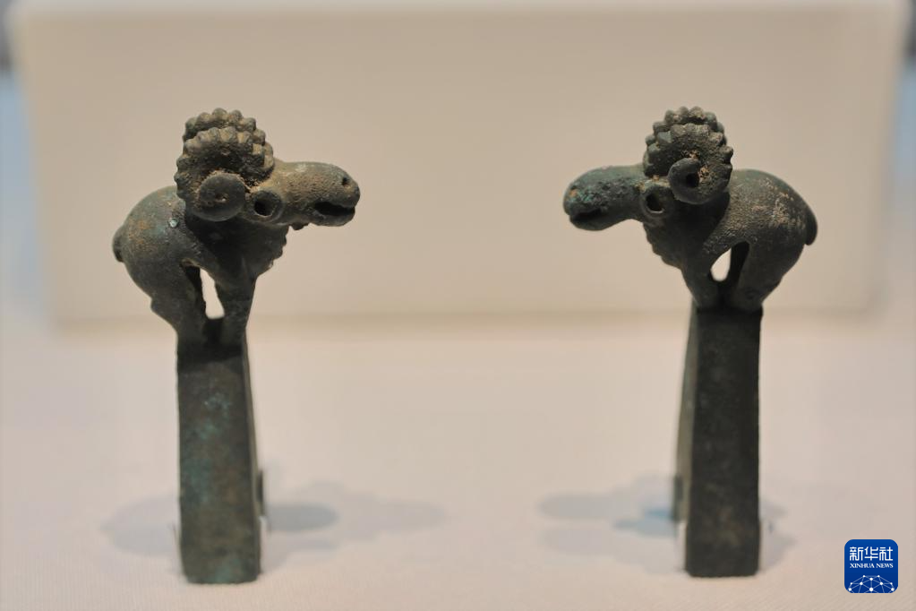 6月9日在“鄂尔多斯青铜器文物精品展”拍摄的展品“盘角羊形青铜杆头饰”。