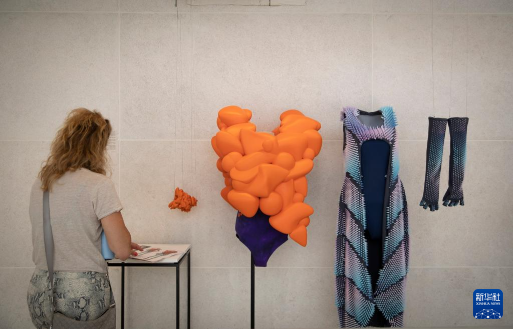 这是8月15日在以色列比撒列艺术设计学院毕业展上拍摄的用3D打印技术制作的服装。