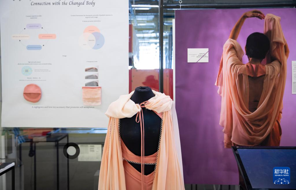这是8月15日在以色列比撒列艺术设计学院毕业展上拍摄的为乳腺癌患者设计的睡衣。