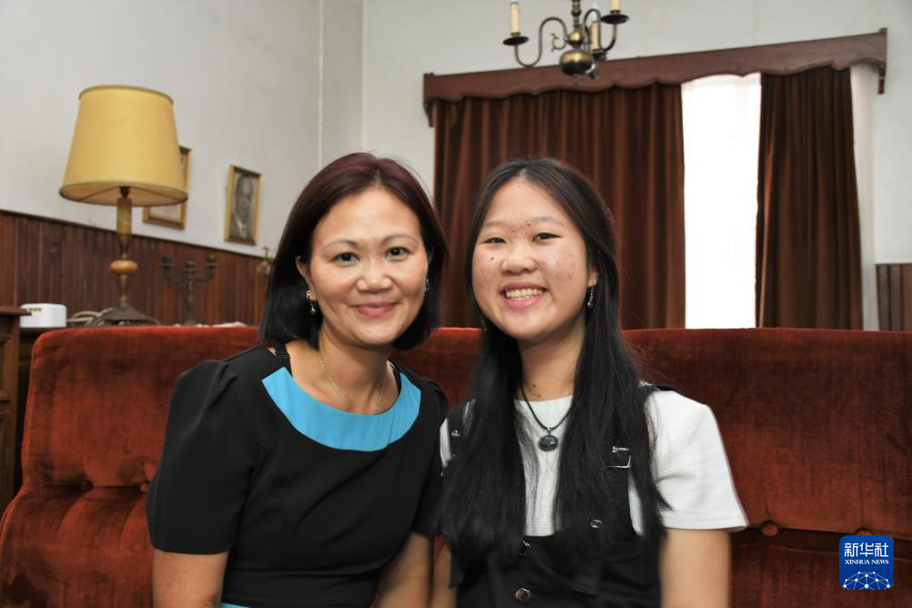 6月8日,毛里求斯17岁高中生莉萨(右)和家人在毛里求斯家中接受新华社记者采访。
