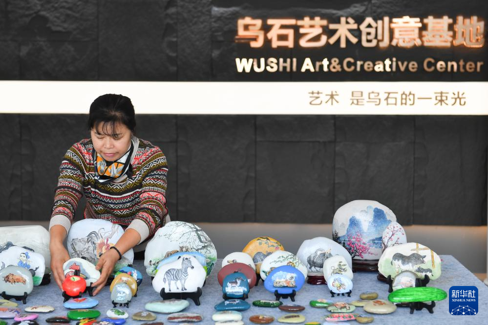 11月8日,在湖南省浏阳市小河乡乌石村的乌石当代艺术馆,农民在整理石头画。