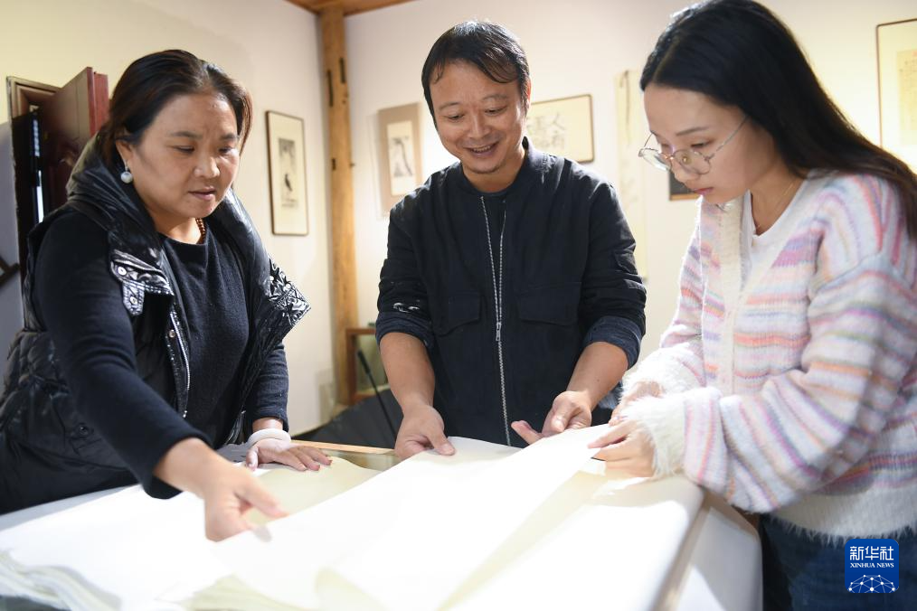11月9日,在开化纸传统技艺工坊,黄宏健(中)和妻子赖丽芳(左)向来访者展示各类纸品。