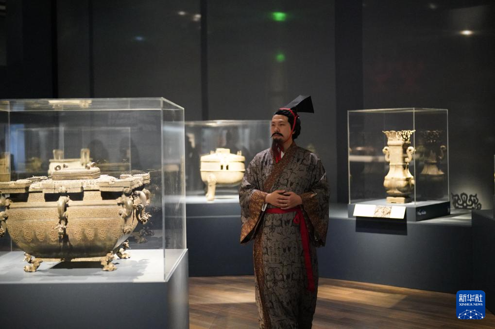 4月19日,一名观众身着汉服在美国旧金山亚洲艺术博物馆举办的“凤凰故国——青铜时代曾楚艺术展”上参观。