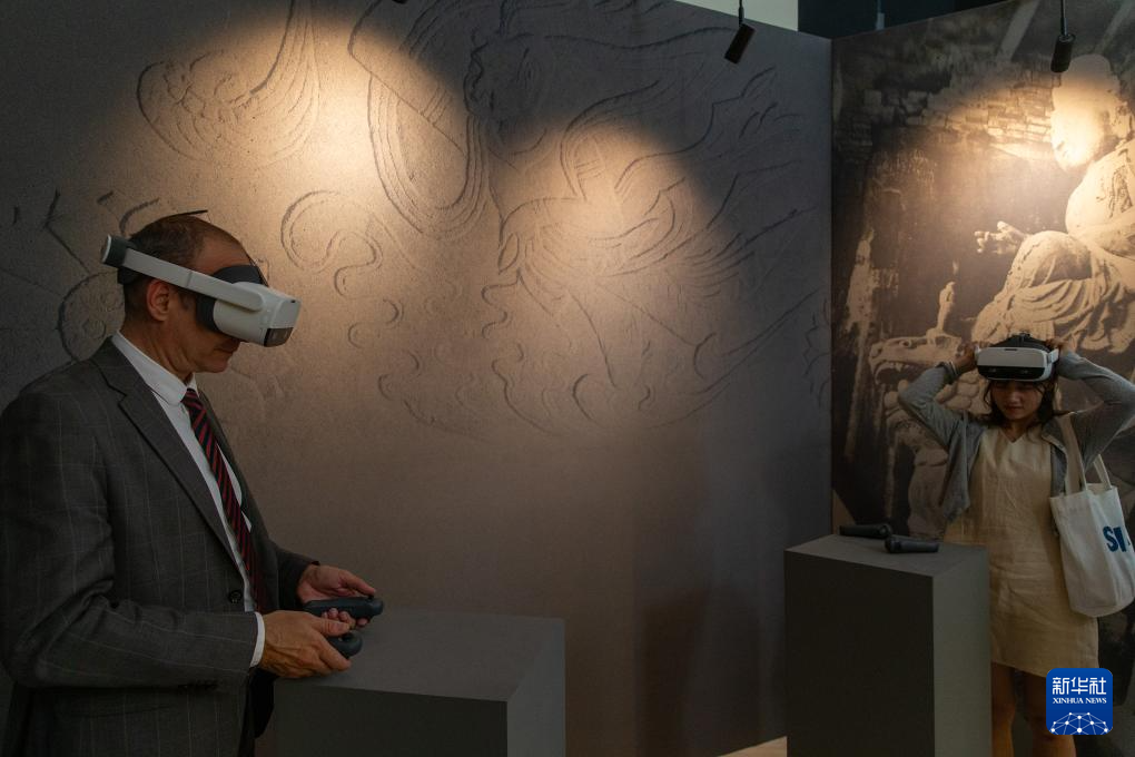 5月11日,参观者在希腊雅典扎皮翁宫使用VR眼镜欣赏中国石窟艺术。