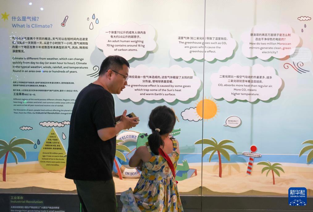 7月4日 ,一位参观者在给孩子讲解展览上的内容。