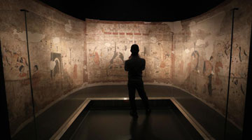11月16日,观众在保利美高梅博物馆参观展出的云锦《丝路华章》卷轴。