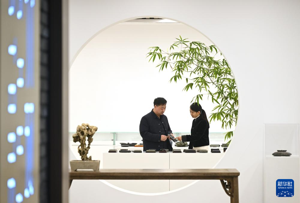 11月25日,邹天然(左)与砚雕师傅在工作室内交流。