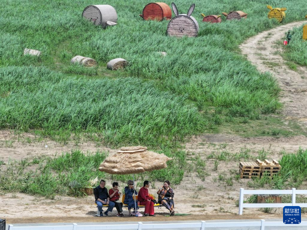 4月17日,在湖南省岳阳市君山区微笑绿洲生态营地,游客在芦苇艺术季活动现场游玩(无人机照片)。