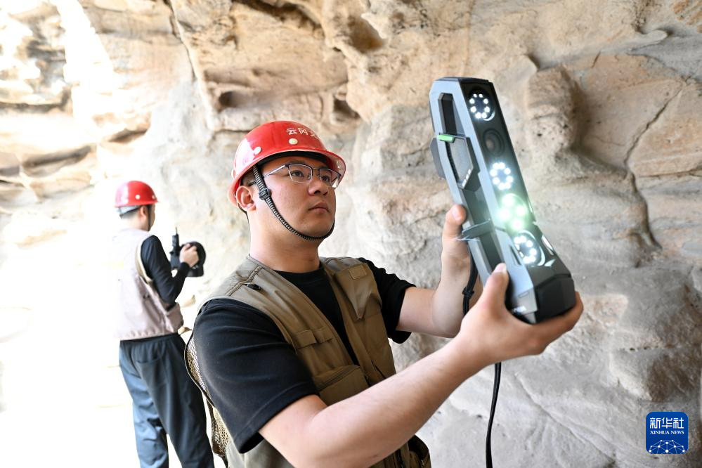 4月16日,在云冈石窟,云冈研究院数字化保护中心工作人员潘博(右)在进行数字化信息采集。