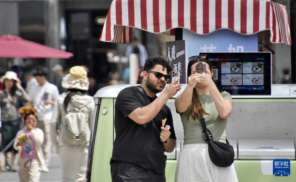 5月4日,游客在798艺术区内戴着VR眼镜游览。