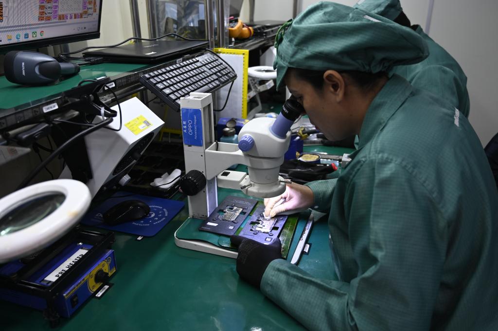 2025年5月21日,在OPPO位于巴西马瑙斯的手机主板制造工厂车间,工人对主板进行检测。新华社记者周永穗摄