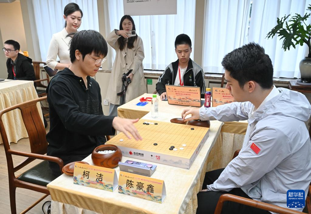 10月28日,深圳龙华队选手柯洁(前左)与福建刺桐棋院队选手陈豪鑫在比赛中。