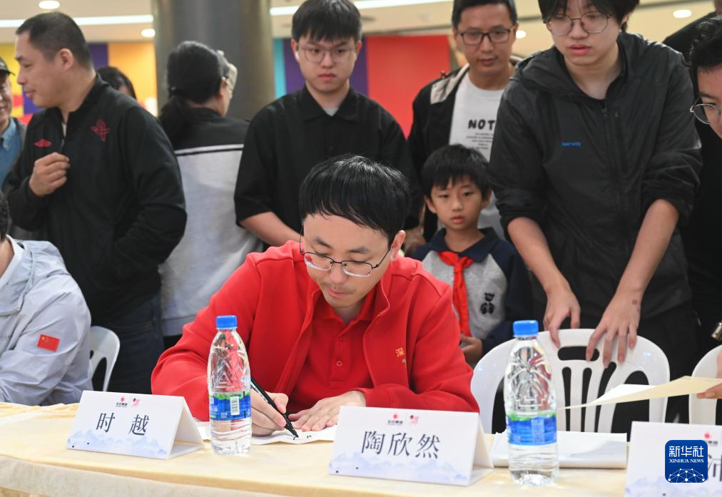 10月28日,深圳龙华队选手时越(前)在开赛仪式现场为围棋爱好者签名。