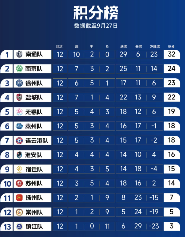 江苏省城市足球联赛常规赛积分榜