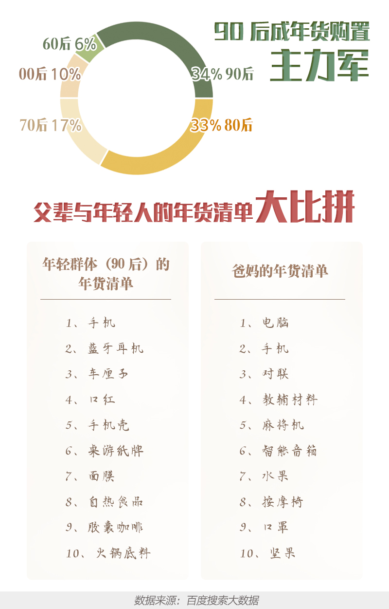??? 在青睞年貨的類(lèi)型上,不同年齡段各有不同。百度搜索大數(shù)據(jù)顯示,以90后為代表的年輕群體的年貨清單集中為數(shù)碼產(chǎn)品、美妝與零食——手機(jī)、藍(lán)牙耳機(jī)與車(chē)?yán)遄拥乃阉麝P(guān)注度位列前三。