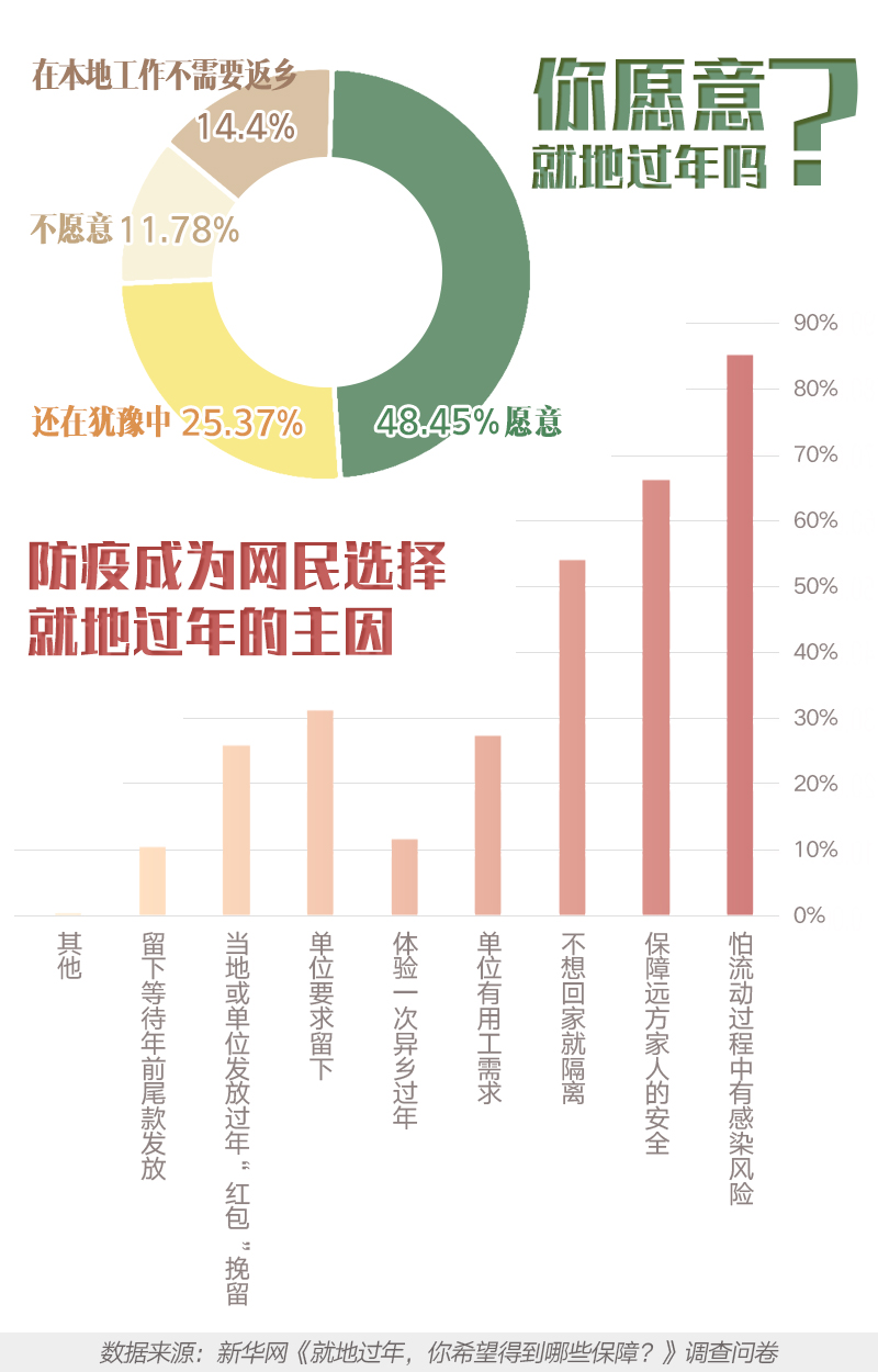 ??? “怕流動(dòng)過(guò)程中有感染風(fēng)險(xiǎn)”是受訪(fǎng)者選擇就地過(guò)年的主要原因,占比為85.11%。“保障遠(yuǎn)方家人的安全(66.28%)”“不想回家就隔離(54.17%)”排在第二、第三位。安心就地過(guò)年,是每位留下的人對(duì)疫情防控的貢獻(xiàn)。