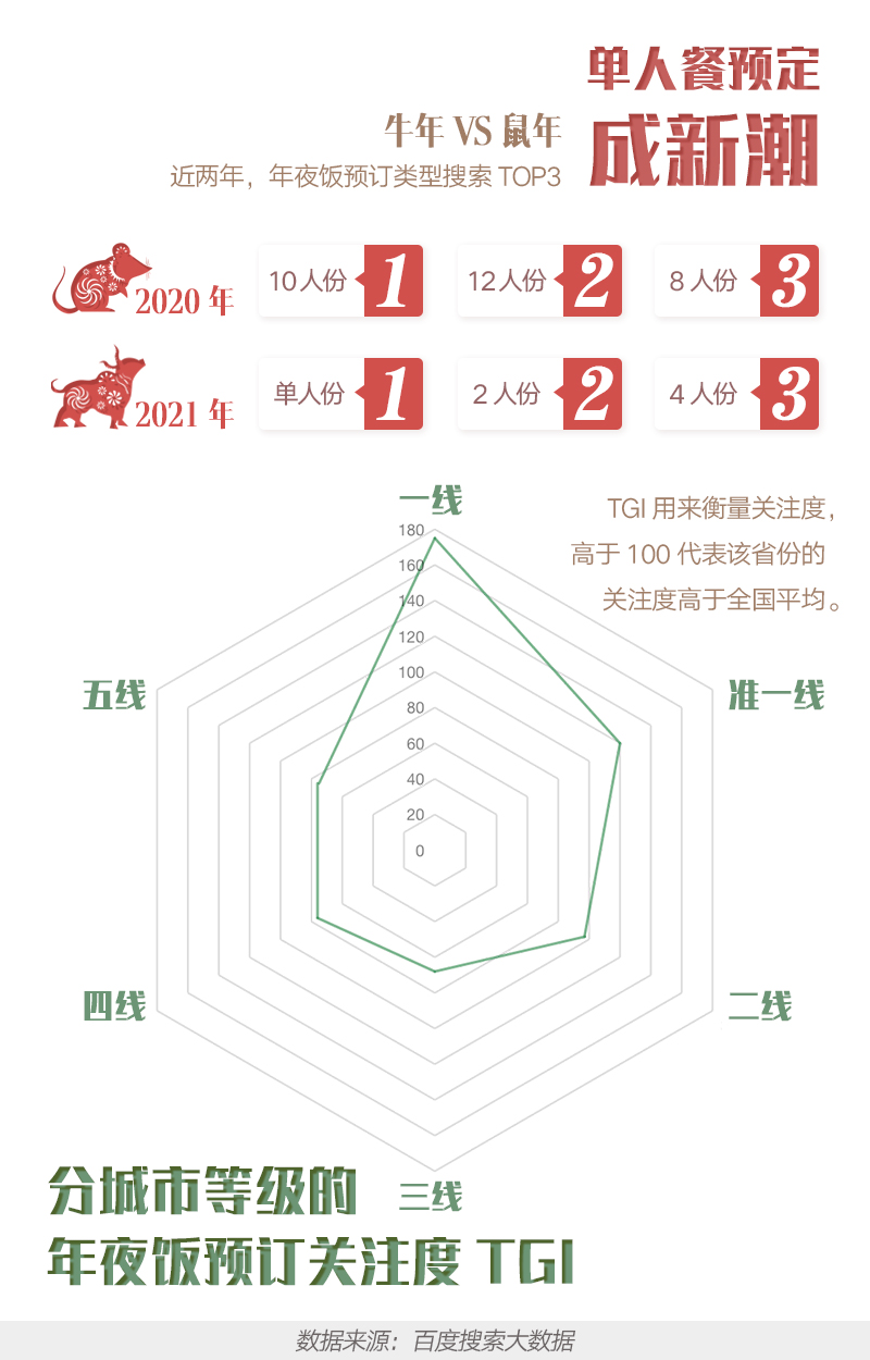 ??? 年夜飯的另外一個(gè)新變化是:許多城市上班族調(diào)整了自己的過(guò)年返鄉(xiāng)計(jì)劃,單人份年夜飯?jiān)谝痪€(xiàn)城市受寵?!栋俣?021年貨搜索大數(shù)據(jù)》顯示,相比去年鼠年8-12人居多的年夜飯預(yù)訂類(lèi)型,今年以4人份、2人份甚至單人份居多。