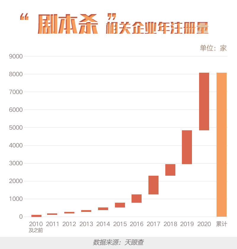 ??? 據(jù)天眼查大數(shù)據(jù)顯示,從事劇本殺相關(guān)企業(yè)近年來(lái)的發(fā)展表現(xiàn)迅猛,有超過(guò)6,500家。2020年共新增劇本殺相關(guān)企業(yè)超過(guò)3,100家,較2019年同比增長(zhǎng)63%。目前知名的線(xiàn)上劇本殺平臺(tái)、劇本殺游戲社交平臺(tái)有我是謎、天天劇本殺、推理大師、百變大偵探、天天狼人殺等。