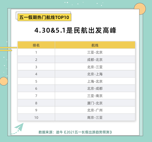 ????? 根據(jù)途牛發(fā)布的《2021五一長假出游趨勢預(yù)測》數(shù)據(jù),在旅游快速復(fù)蘇、“加長版”假期、旅游優(yōu)惠活動等多重利好下,今年“五一”計(jì)劃出游的人數(shù)將暴增。出行人數(shù)的激增使多條熱門航線票價(jià)大漲,4月30日和5月1日兩天是民航出發(fā)最高峰,而返程高峰將出現(xiàn)在5月4日、5日的假期末尾。