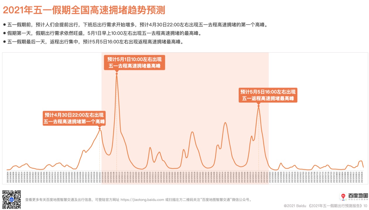 ????? 假期前,預(yù)計(jì)人們會提前出行,下班后出行需求開始增多,預(yù)計(jì)4月30日22:00左右出現(xiàn)五一去程高速擁堵的第一個(gè)高峰。