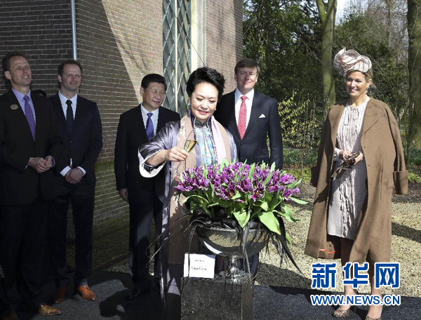 3月23日,中國(guó)國(guó)家主席習(xí)近平和夫人彭麗媛在荷蘭國(guó)王威廉-亞歷山大和馬克西瑪王后陪同下參觀中荷農(nóng)業(yè)合作和荷蘭郁金香花展。彭麗媛應(yīng)邀將新培育的郁金香命名為“國(guó)泰”,并按當(dāng)?shù)貍鹘y(tǒng)澆上香檳。資料圖