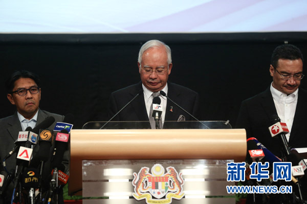3月24日,在馬來西亞吉隆坡,馬來西亞總理納吉布(中)就馬航失聯(lián)航班舉行記者會。馬來西亞總理納吉布當(dāng)日在吉隆坡宣布,根據(jù)最新信息,馬航失聯(lián)航班MH370在南印度洋墜毀。 新華社記者 王申 攝