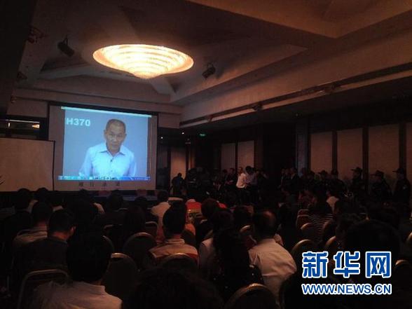5月1日,在北京麗都維景酒店,乘客家屬在收看馬來(lái)西亞航空公司首席執(zhí)行官葉海亞發(fā)表聲明的視頻連線。 新華社記者 沈伯韓 攝