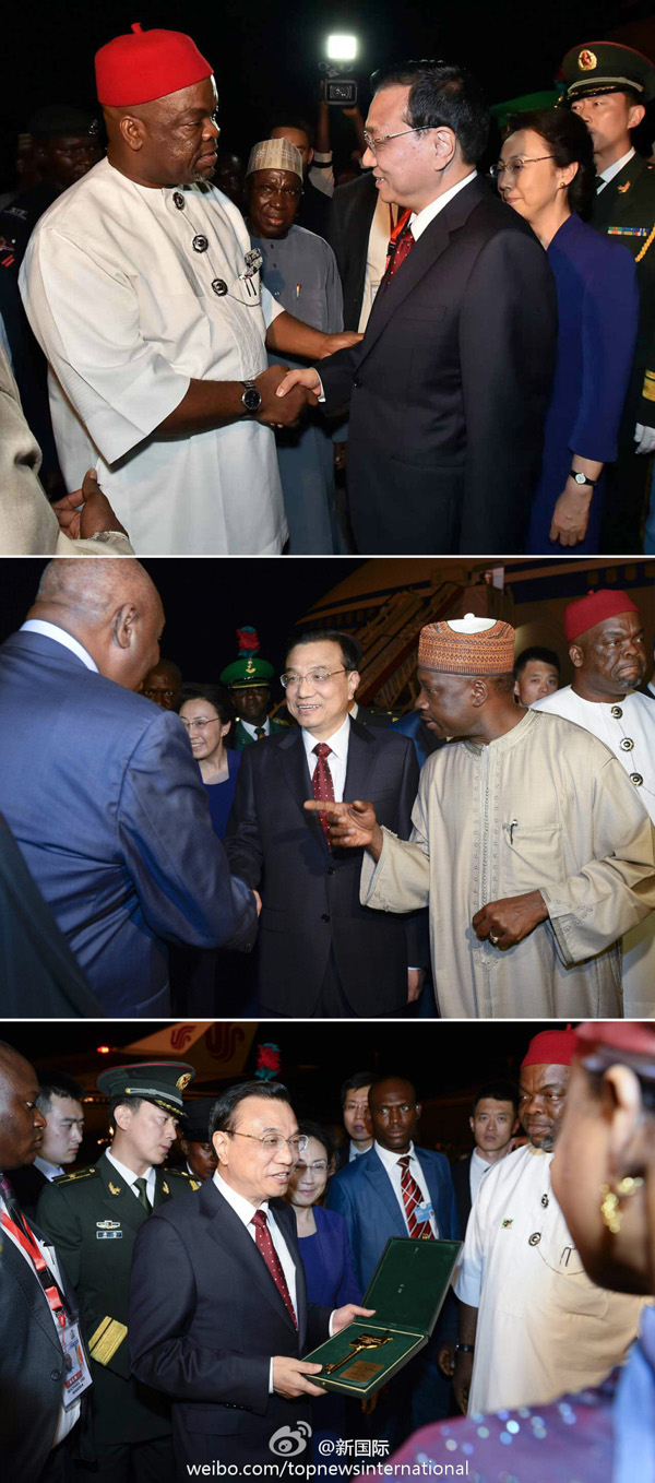 新華網(wǎng)北京5月7日電? 據(jù)新華社“新國(guó)際”微博報(bào)道,國(guó)務(wù)院總理李克強(qiáng)6日晚抵達(dá)阿布賈,開(kāi)始對(duì)尼日利亞進(jìn)行正式訪問(wèn)并出席第24屆世界經(jīng)濟(jì)論壇非洲峰會(huì)全會(huì)。夫人程虹同機(jī)抵達(dá)。尼外交部長(zhǎng)、勞工部長(zhǎng)到機(jī)場(chǎng)迎接,聯(lián)邦首都區(qū)部長(zhǎng)按照接待尊貴客人的傳統(tǒng)禮儀,向李克強(qiáng)贈(zèng)送了阿布賈城市鑰匙,熱烈歡迎中國(guó)總理到訪。
