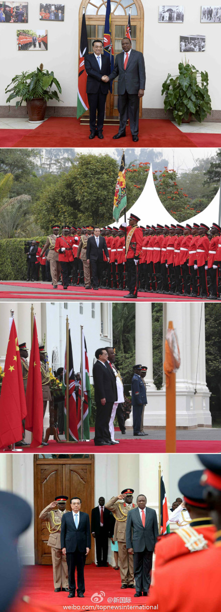 ????新華網(wǎng)北京5月10日電? 據(jù)新華社“新國際”微博報(bào)道,肯尼亞總統(tǒng)肯雅塔10日上午在國家宮為中國總理李克強(qiáng)舉行隆重歡迎儀式?,F(xiàn)場鳴放禮炮,軍樂隊(duì)奏兩國國歌。李克強(qiáng)檢閱了儀仗隊(duì)。