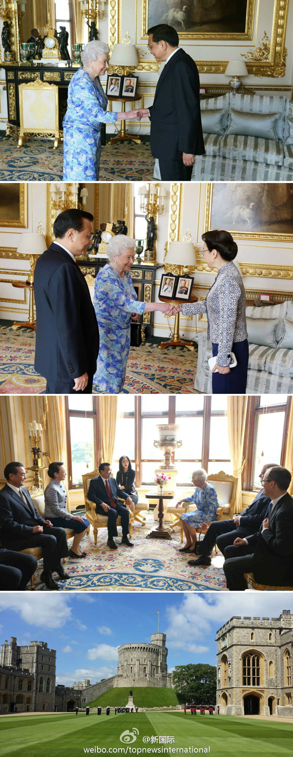 新華網(wǎng)北京6月17日電 據(jù)新華社“新國際”微博報道, 國務院總理李克強17日上午在溫莎宮會見英國女王伊麗莎白二世。李克強說,中英兩國堪稱東西方文明的代表,我們愿與英方互學互鑒。中國歡迎英國王室成員多到中國走一走,看一看。女王愉快回憶起1986年訪華時情景,稱中國之行給她留下深刻印象。